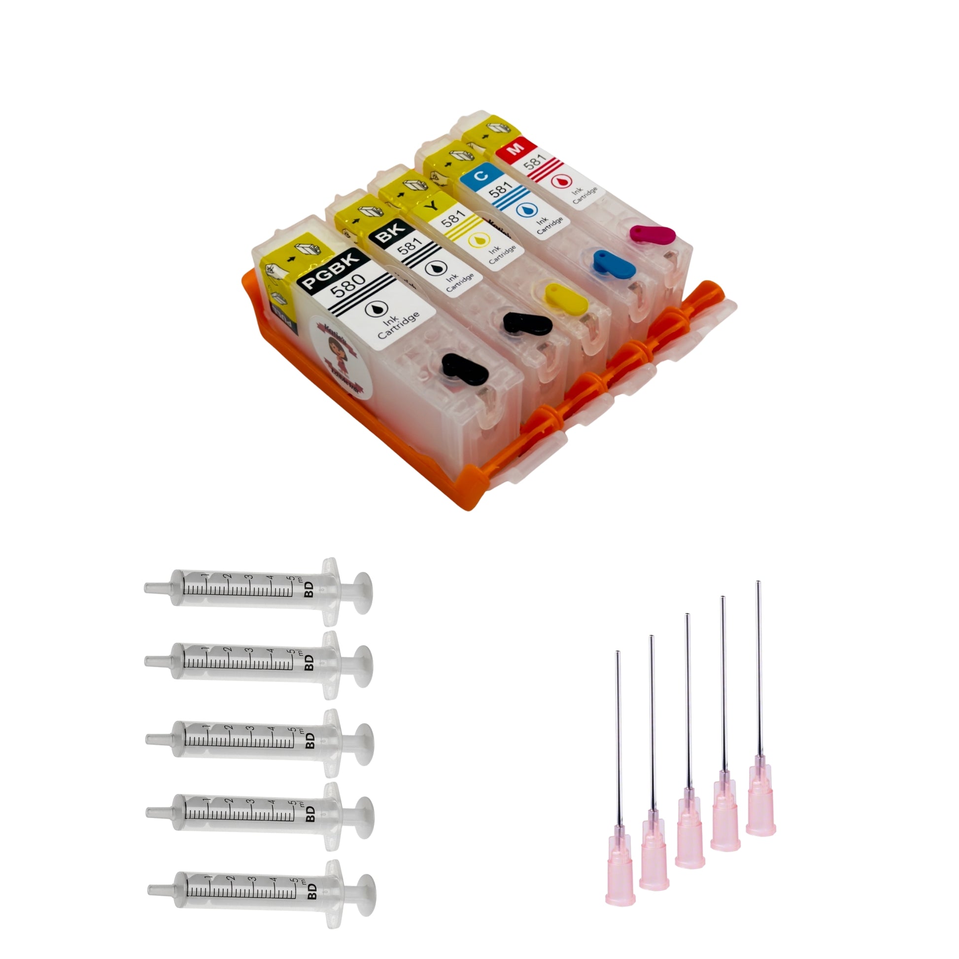 Refillable Katie's Edible Ink PGI-580BK / CLI-581 PGBK/BK/C/M/Y Ink Cartridges (580xl / 581xl) Compatible With Canon TS705 TS705a Printer Full Set With Needles Chipped Ready To Use